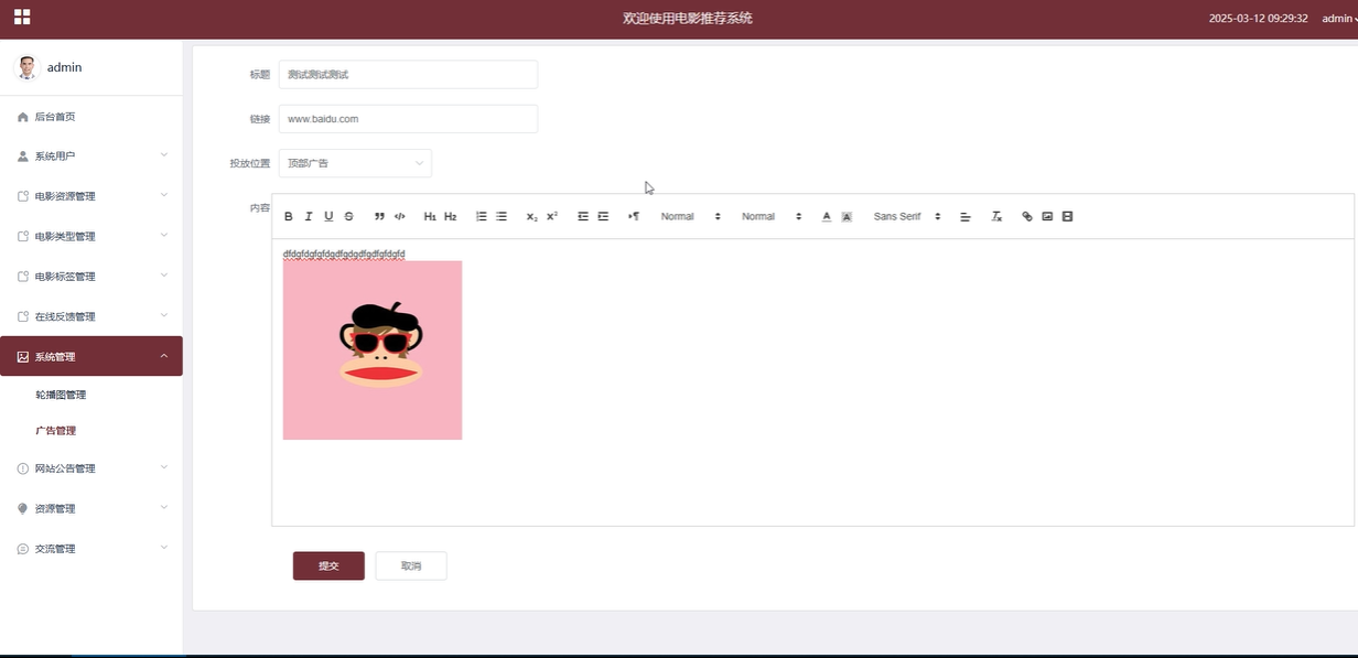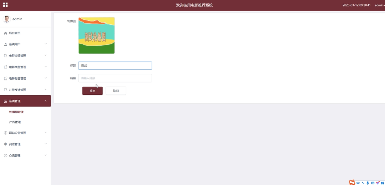系统管理:系统管理模块允许管理员管理平台的轮播图和广告内容。管理员可以查看、搜索、增删改查轮播图和广告信息,确保重要内容及时更新并展示给用户。