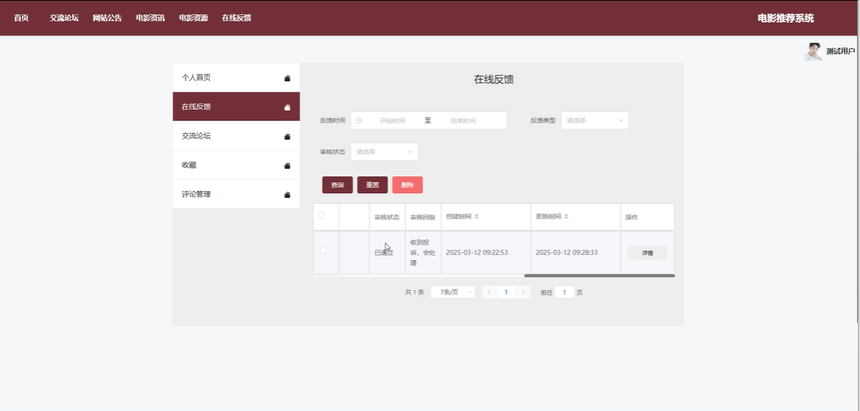 在线反馈:用户可以查看提交的反馈详情,进行搜索、查询、重置或删除已提交的反馈内容。待管理员审核后,用户可以查看反馈的处理结果,确保反馈的有效性。