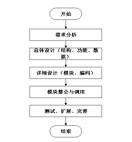 系统开发流程的主要步骤,从需求分析到系统完成的全过程。流程包括需求分析、总体设计(结构、功能、数据)、详细设计(模块、编码)、模块整合与调用,以及测试、扩展和完善,最终完成系统的开发。本系统的开发流程如下图所示