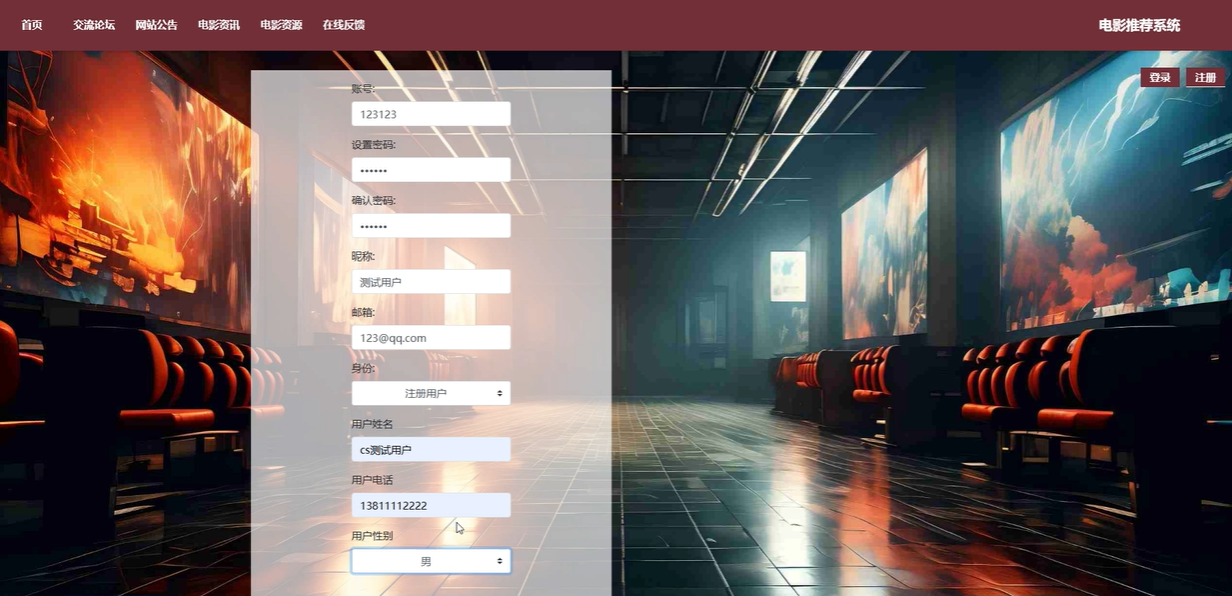 注册登录:电影推荐系统提供了一个直观易用的前端注册登录模块,允许新用户快速创建账户,并让现有用户便捷地登录。注册时,用户需要填写必要的信息,如用户名、邮箱和密码。