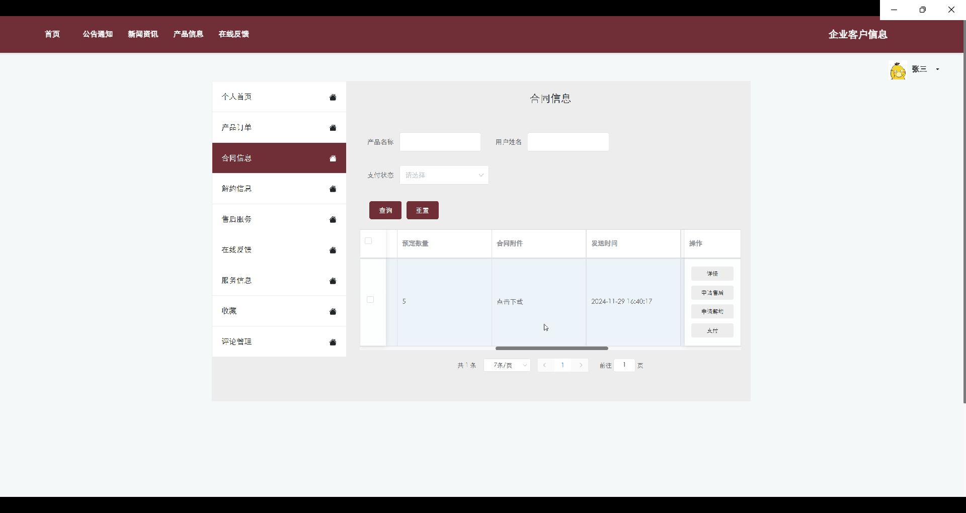 在实际应用中,系统有效地简化了企业的日常管理工作,包括但不限于产品信息更新、订单处理、合同管理以及售后服务等。对于管理员而言,全局视角的数据监控与用户管理能力得到了显著增强;员工用户能够更加专注于业务流程的推进与优化;而对于注册用户来说,他们享受到了更便捷的产品浏览、预订服务及售后支持,大大提升了用户体验和满意度。此外,集成的Spring Security框架为系统资源提供了强大的认证和授权机制,进一步增强了系统的安全性。
