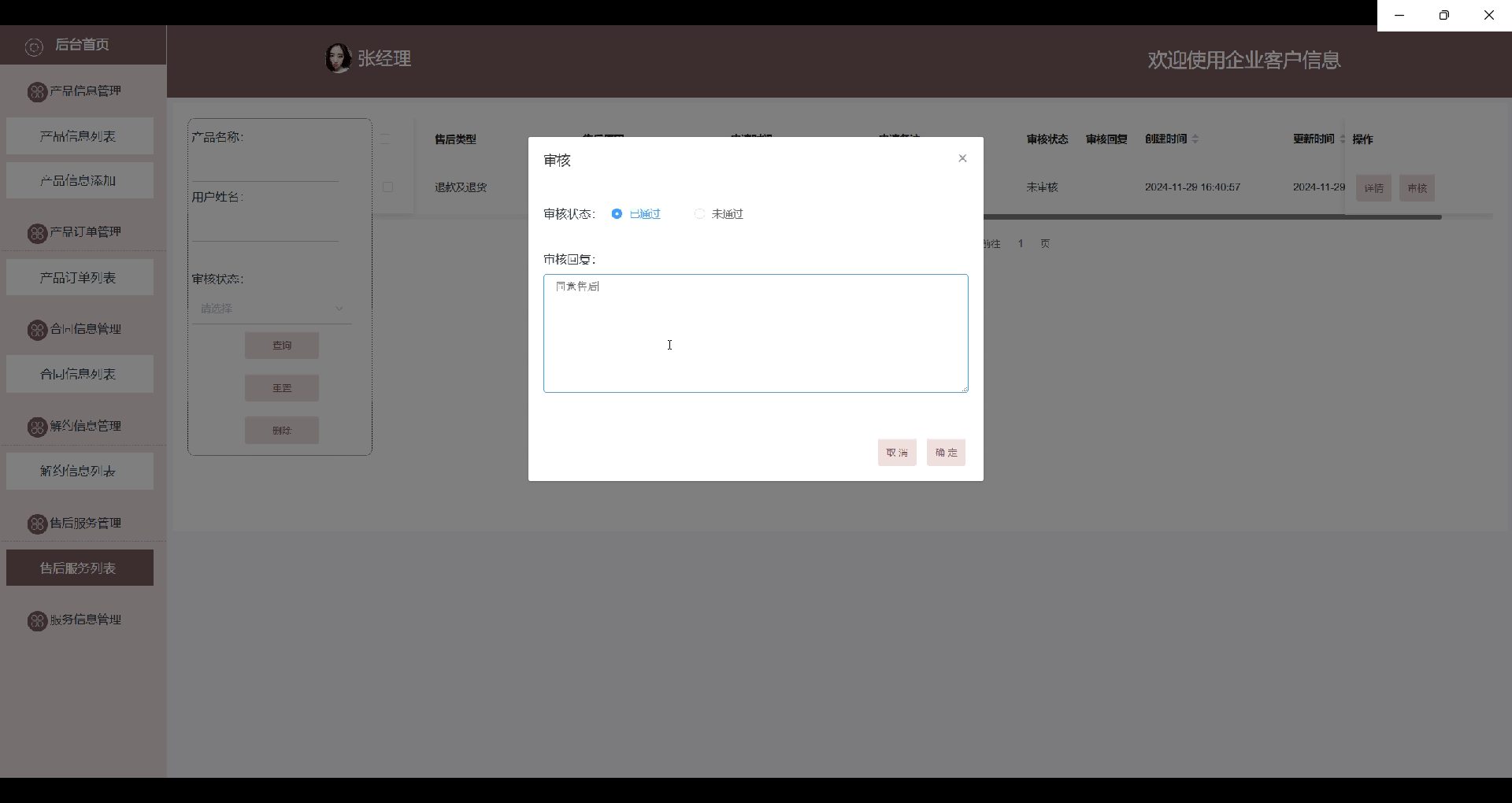 售后服务管理功能允许员工审核客户的售后申请。员工需详细审查申请内容,确认问题描述,并根据情况安排相应的售后服务。界面如下所示。