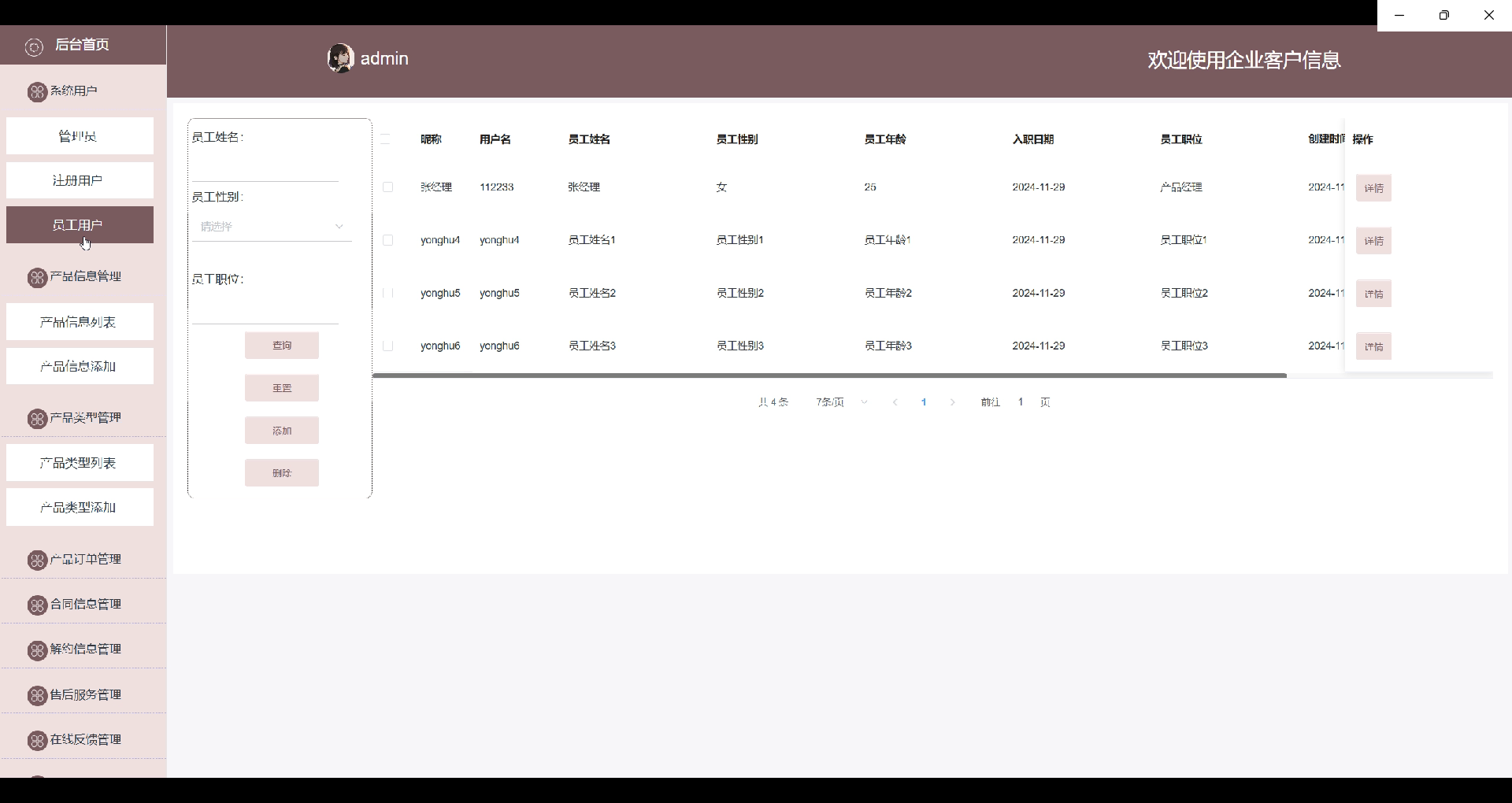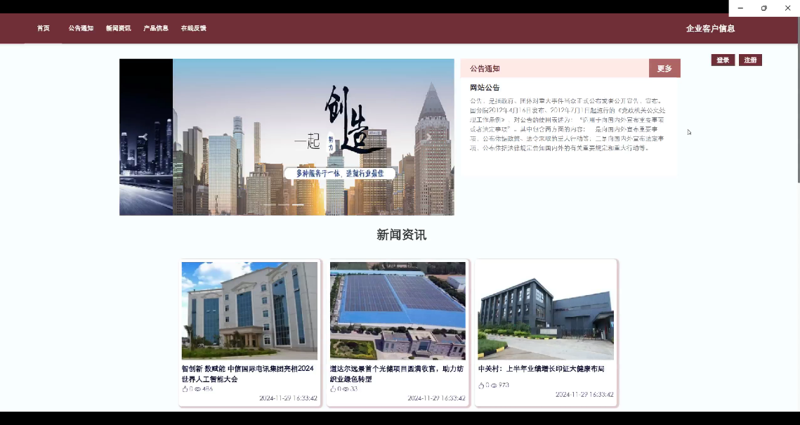 企业客户信息管理系统旨在通过全面的功能覆盖,支持管理员、员工用户和注册用户的多样化需求。系统提供产品和订单管理、合同处理、售后服务、在线反馈等功能,确保信息流和服务流程高效运转。管理员全面监控系统,员工用户推动具体业务流程,注册用户则享受便捷的服务体验,共同构建一个互动性强、响应迅速的企业服务平台。