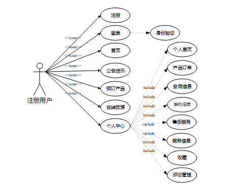 注册用户可以浏览产品详情、提交预订、查看订单状态、申请解约及售后服务,并通过在线反馈表达意见。此外,他们还能收藏感兴趣的产品,管理个人评论,享受个性化的用户体验,所有操作皆为方便快捷地获取所需服务和支持。注册用户角色用例如下图所示。