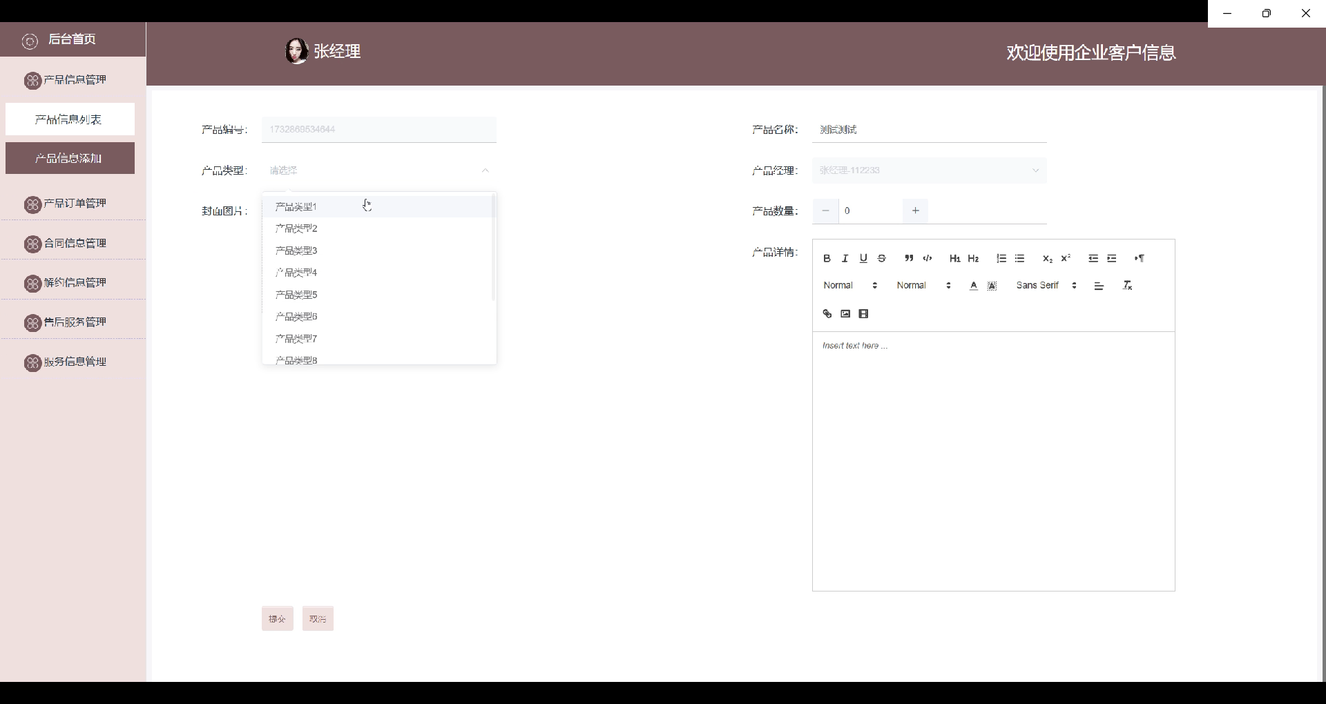 产品信息管理功能使员工能够添加新产品信息至系统。通过填写详细的产品参数如名称、类型、价格等,并上传相关图片或文档,确保产品信息的准确性和完整性。界面图如下所示。