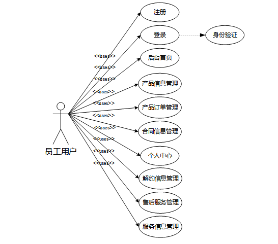 员工用户可执行产品信息添加、订单与解约申请审核、合同信息管理等任务。他们专注于服务流程的推进,从订单处理到售后服务的每个环节,均需员工用户的审核与跟进,确保服务质量达到高标准,同时支持客户的需求。员工用户角色用例如下图所示。