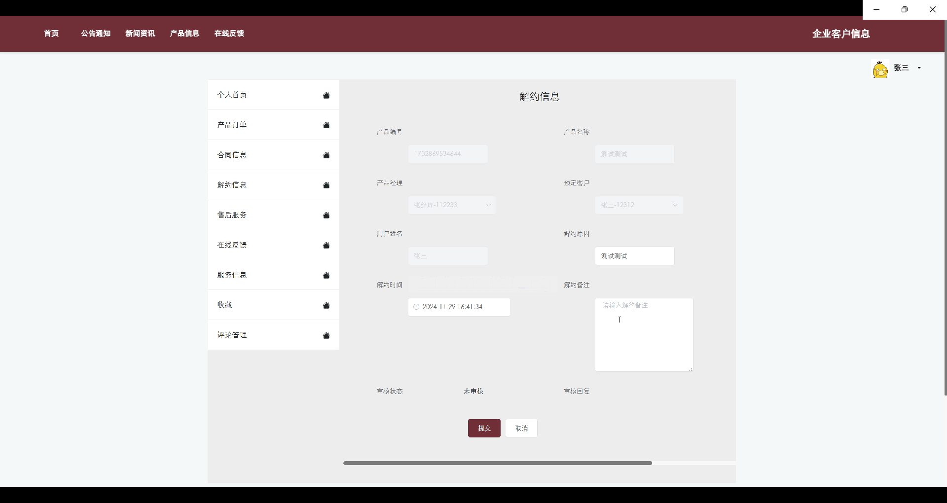 解约信息功能使用户能够发起解约申请。用户提交解约请求后,系统会生成相应的记录并通知相关用户。此过程简单快捷,确保用户在需要终止合同时能迅速得到响应。界面图如下所示。