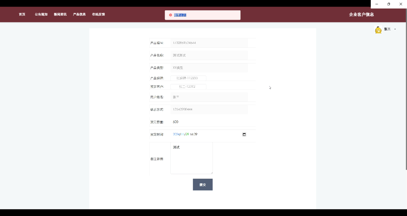 | 前置条件 | 1. 注册用户已成功注册并登录到企业客户信息管理系统;<br>2. 系统中存在可供预订的产品信息。 |