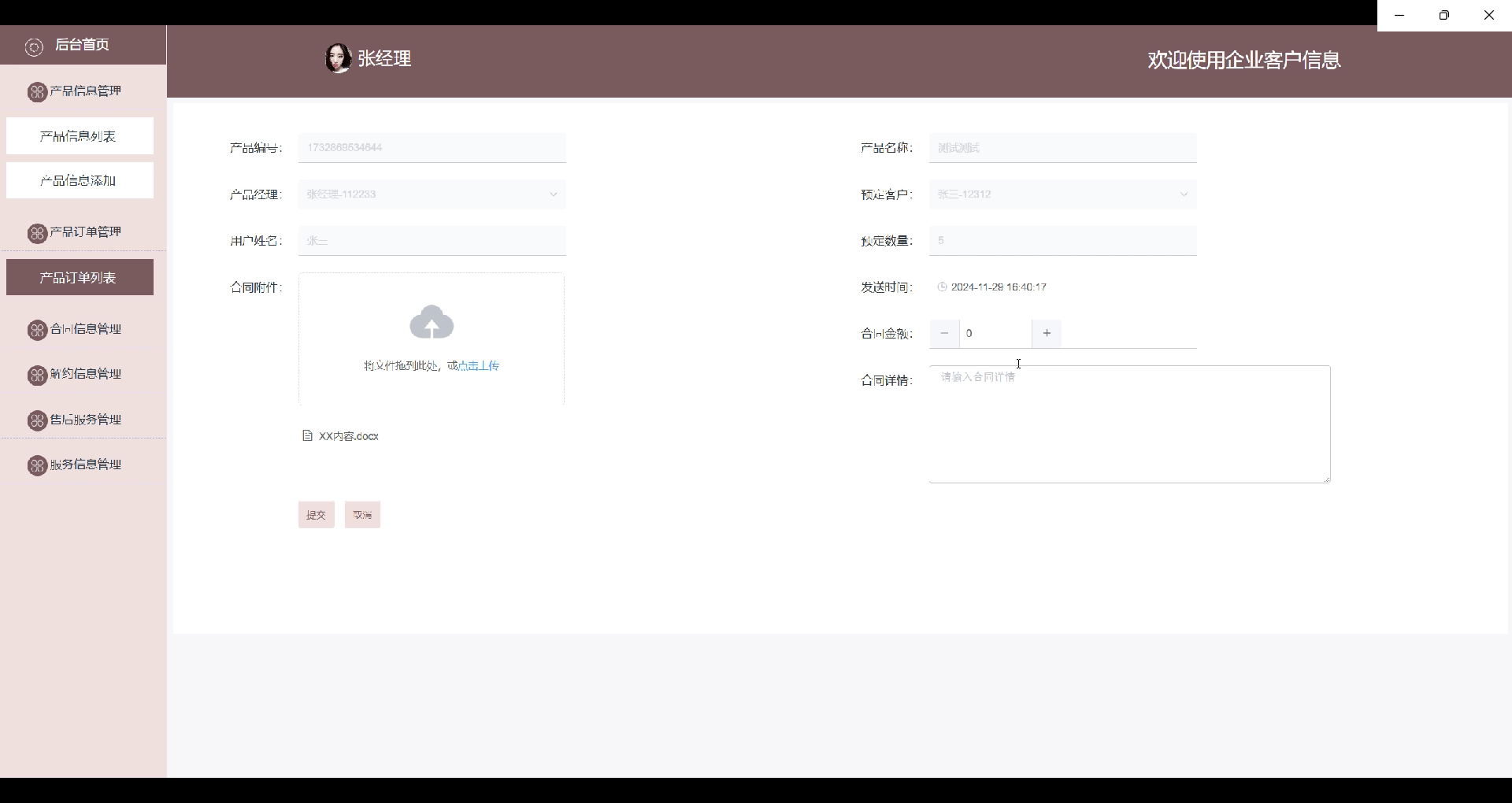 | 基本流 | 1. 系统展示合同信息列表,包括合同编号、客户信息、产品信息等。 2. 管理员或员工用户选择添加新合同或编辑现有合同信息。 3. 如果是添加新合同,用户填写所有必要的合同信息并上传合同附件;如果是编辑,则修改相应字段。 4. 用户提交合同信息,系统验证信息是否完整且符合要求。 5. 验证通过后,系统保存合同信息并提示用户操作成功。 |