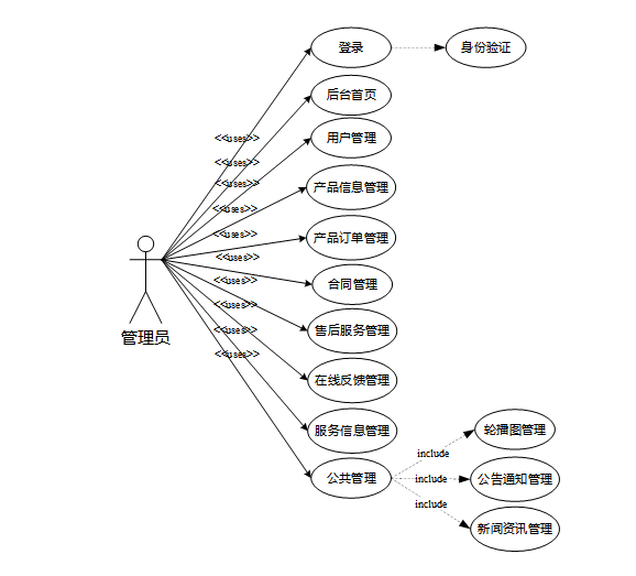 管理员拥有最高权限,能够访问和管理系统的各个方面,包括用户管理、产品信息管理、订单及合同处理、售后服务等。此外,管理员负责审核员工注册请求,维护网站内容如轮播图、公告通知与新闻资讯,确保系统运行顺畅并满足企业需求。管理员角色用例如下图所示。