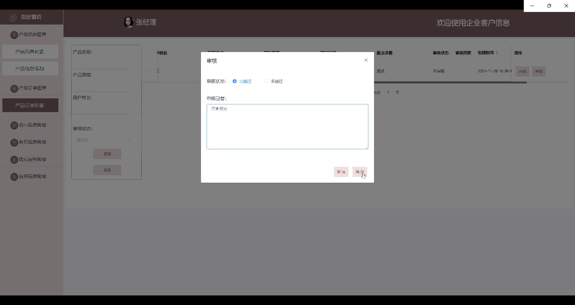 | 前置条件 | 1. 管理员或员工用户已成功登录到企业客户信息管理系统; 2. 系统中存在待审核的产品订单。 |