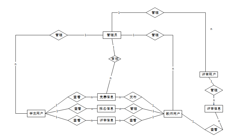 系统主要由管理员、教师用户、学生用户和评审用户四个角色组成。管理员负责系统的整体管理,包括竞赛信息、竞赛类型、报名信息和评审信息的维护。教师用户能够管理竞赛内容、查看报名情况并参与评审工作。学生用户通过系统查询竞赛信息,完成报名操作,并查看评审结果。评审用户则主要负责对参赛作品进行评分和评价。系统采用了模块化设计,使得每个角色的功能独立而又紧密联系,确保了各类信息的有序流转与高效处理。