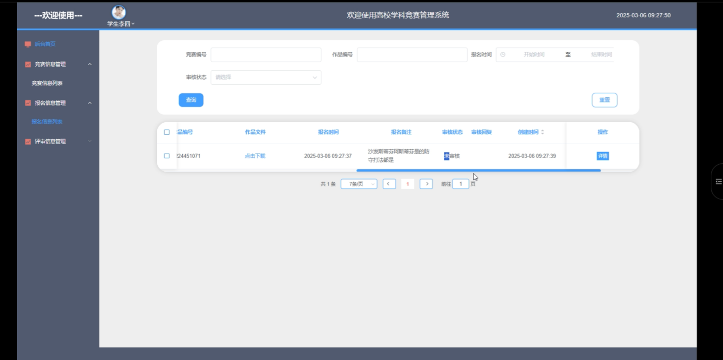 学生用户可以在后台首页查看所有竞赛信息,了解不同类型的竞赛活动以及相应的报名要求。学生可以通过系统进行竞赛报名,并查看报名的详细信息。学生还可以查看自己参加的竞赛评审结果,以便了解竞赛进程和成绩。