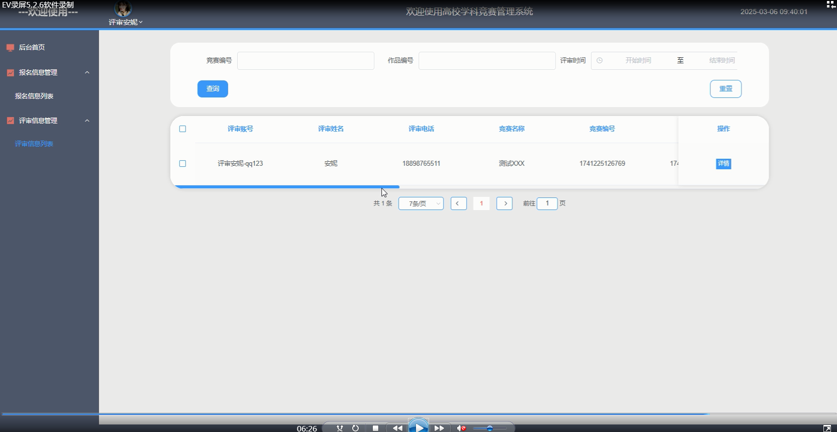 评审用户点击“评审信息管理”这一菜单会显示评审信息列表这个子菜单,点击“评审信息列表”可以查看评审信息详情,可以进行查询、重置的操作。评审信息管理界面如下图所示。