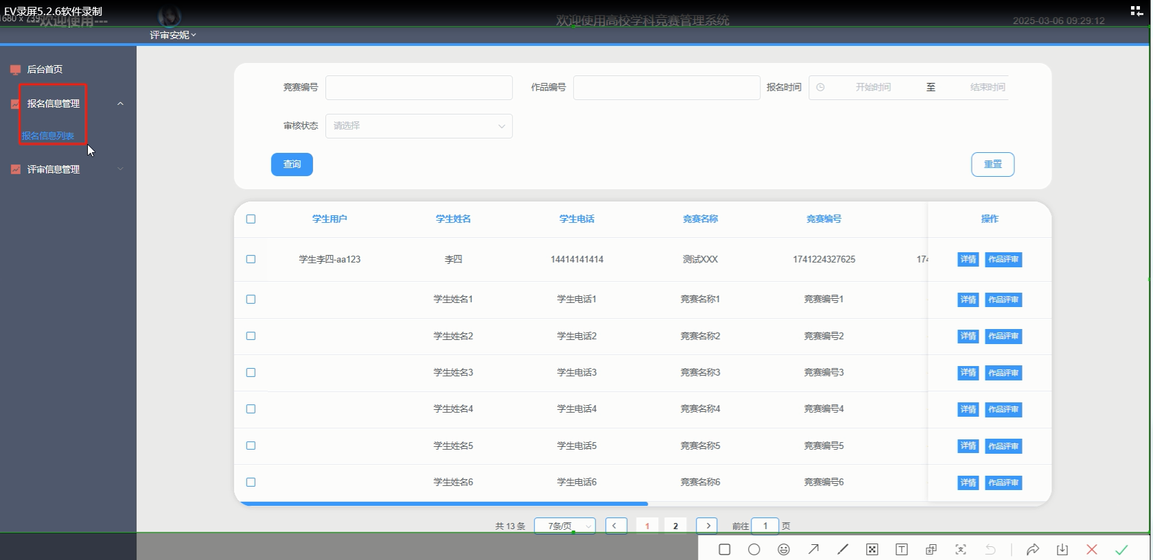 管理员点击“报名信息管理”这一菜单会显示报名信息列表这个子菜单,点击“报名信息列表”可以查看报名信息详情,可以进行查询、重置、删除、作品评审和审核的操作。报名信息管理界面如下图所示。
