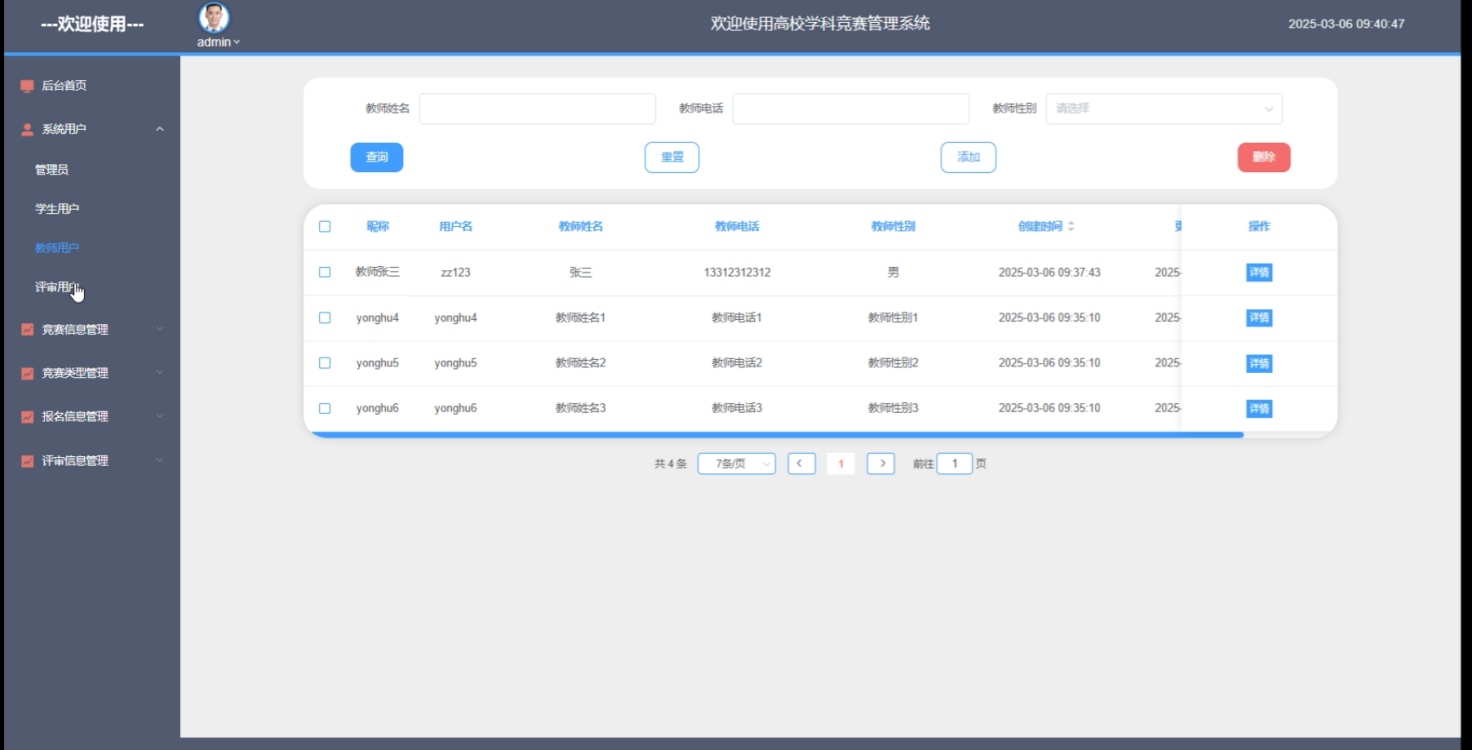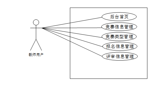 教师用户在后台首页可以查看竞赛信息、管理不同类型的竞赛,并查看报名信息。教师可以对竞赛信息进行修改、更新,并且能够管理竞赛的具体内容。教师还可查看报名信息和评审信息,但其权限通常不涉及系统用户管理。教师用户的主要职责是在竞赛过程中提供支持和指导,并参与评审工作。