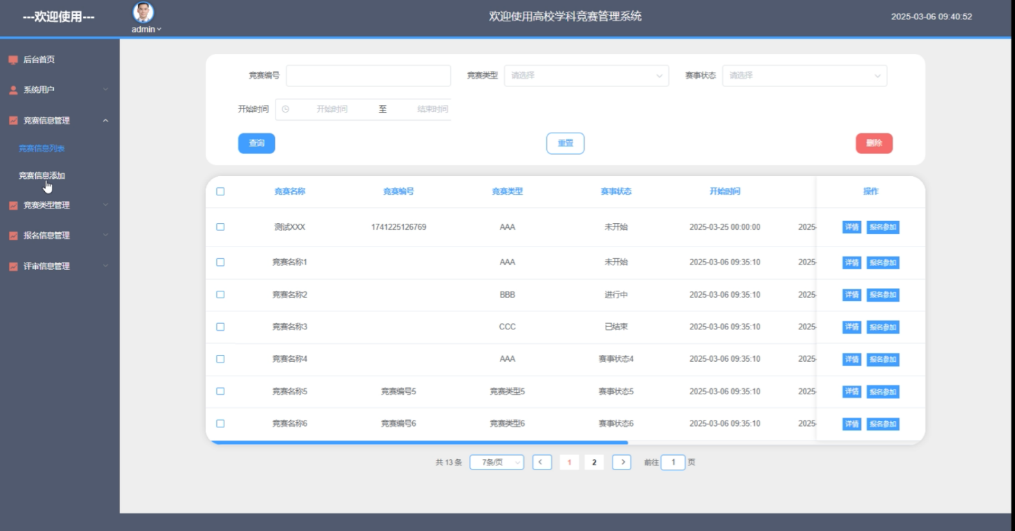 The system supports user permission management, real-time data updates, and dynamic management of competition information, and can respond to various changes in common needs in university subject competition management. Through this system, teachers and students can participate in competition management more conveniently, and the backend management interface of the system also provides an intuitive operating platform for administrators, greatly improving the efficiency of competition management.
