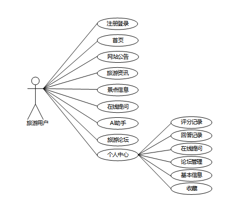 旅行用户通过智能旅行助手系统可以方便地浏览和筛选景点信息,获取个性化的旅行推荐,并参与互动交流。用户可以在小程序中根据景点类型、等级等条件进行搜索,并依据综合评分、点赞数等进行排序,找到心仪的景点。此外,用户还可以提交在线提问,获得管理员的及时答复或利用问答AI助手获取即时帮助。用户还能在旅游论坛中分享经验、发表评论和评分,与其他用户互动,提升旅行体验。旅行用户用例图如下所示: