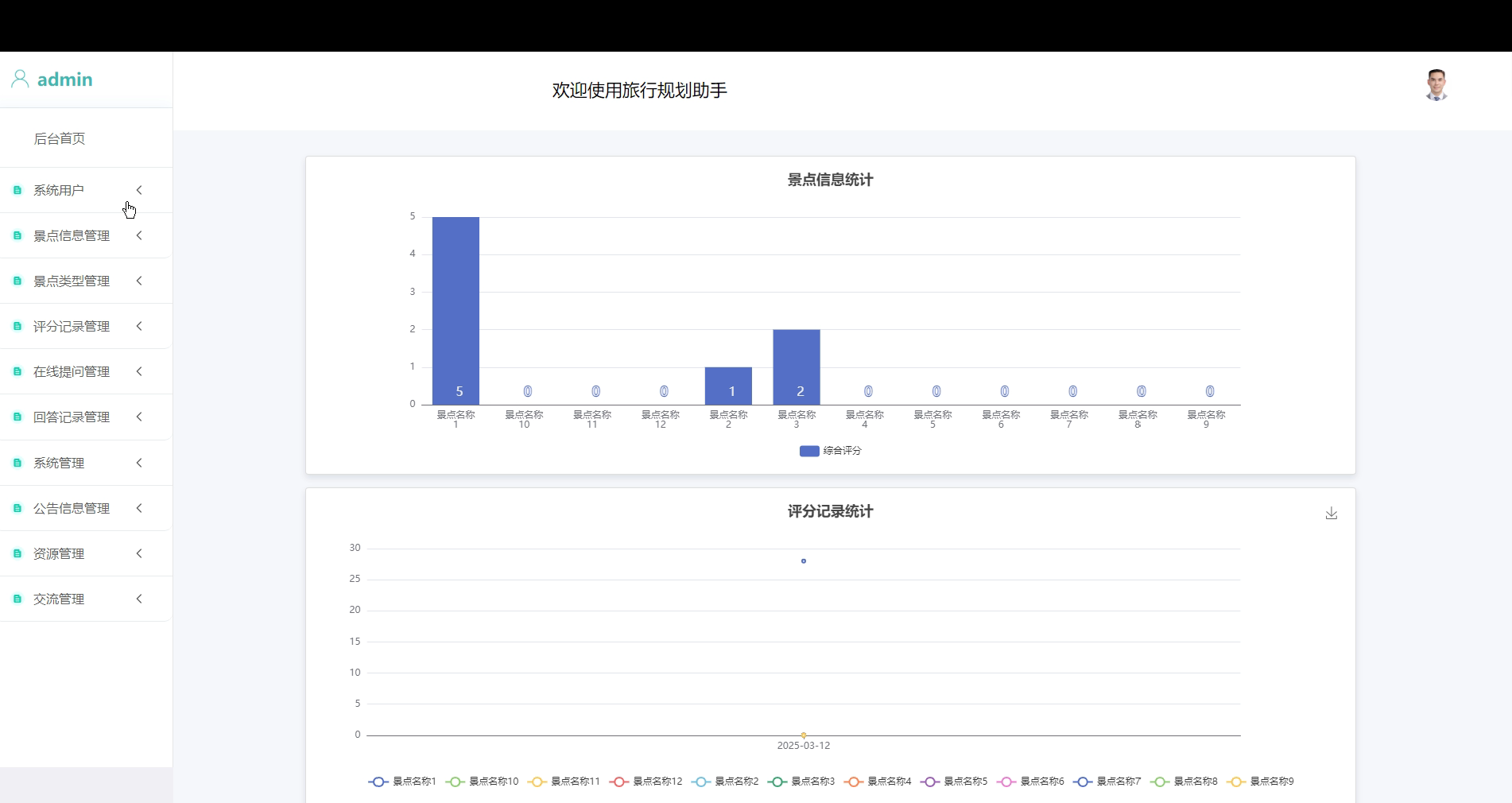 后台首页:展示景点信息统计和评分记录统计,帮助管理员快速掌握平台运营状况。