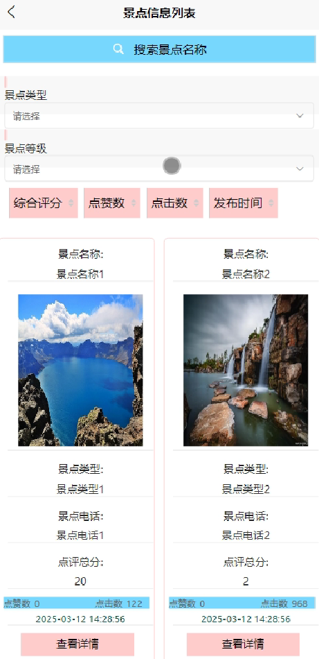 景点信息:支持多条件筛选(如景点类型、等级)和排序(如综合评分、点赞数、点击数、发布时间),帮助用户精准找到心仪的景点。