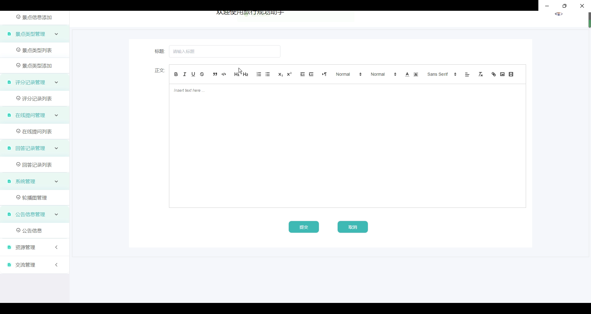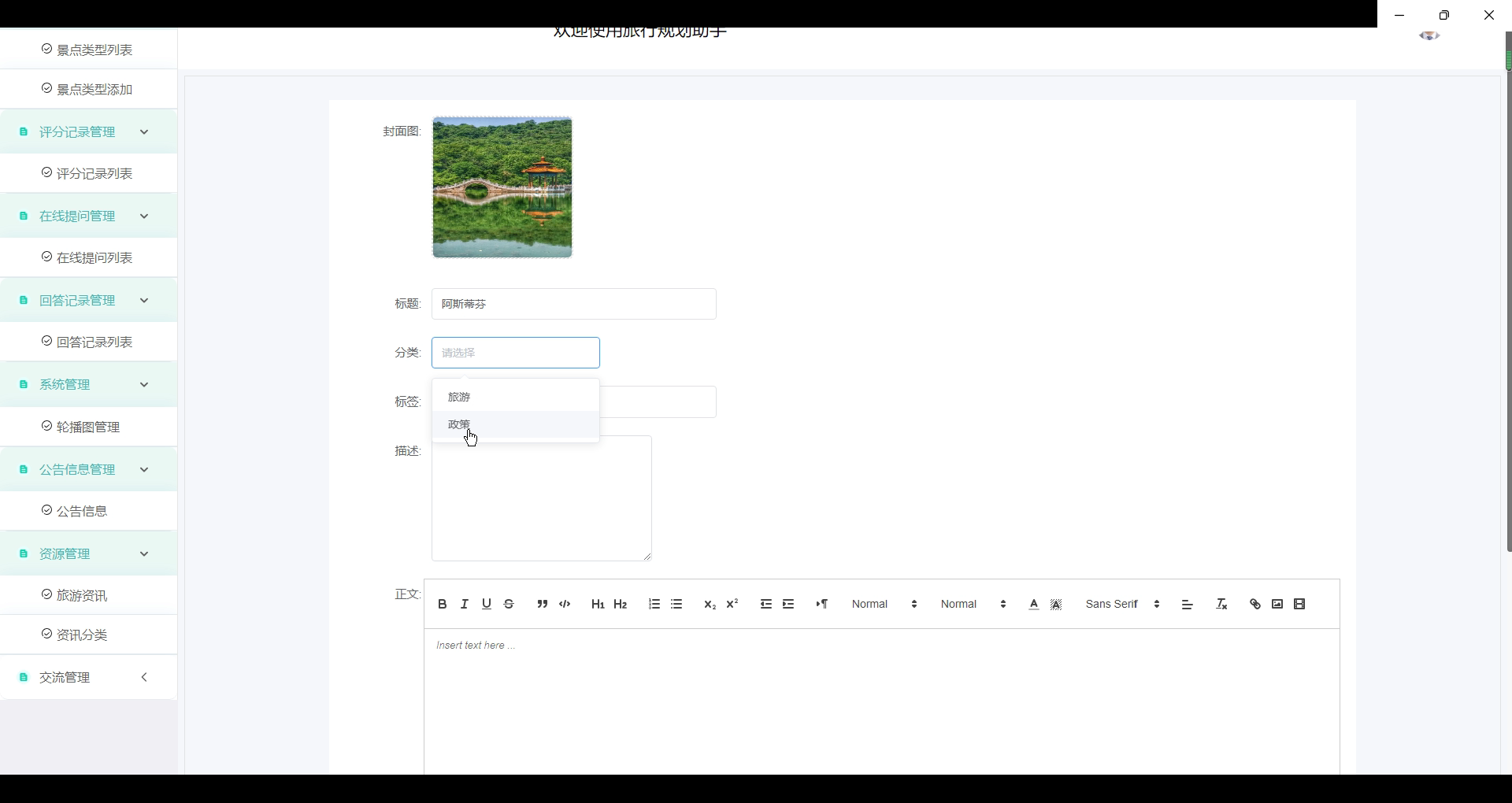旅游资讯管理:提供丰富的旅行攻略、地方特色介绍等资讯,为旅行用户的出行提供参考。