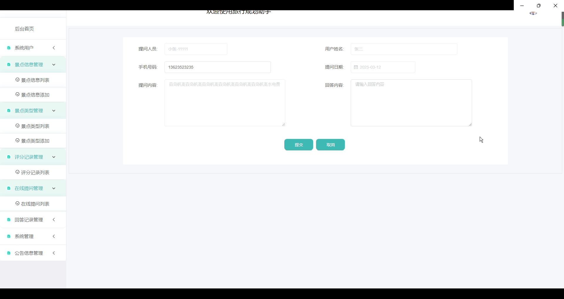 在线提问:用户可提交旅行相关问题,由管理员或问答AI助手提供专业解答。