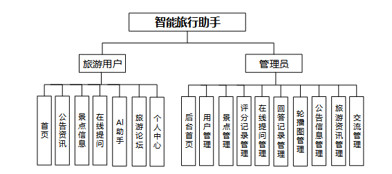 智能旅行助手为旅游用户和管理员提供了全面的功能。旅游用户可通过首页获取个性化推荐、查看公告和资讯、筛选并评价景点、提问及使用AI助手等。管理员则负责后台管理,包括景点信息、评分记录、用户管理及内容发布等,确保平台信息准确和服务质量。系统通过协同过滤推荐、详细的景点筛选功能以及互动交流平台,旨在提升用户体验,促进旅游信息的有效传播与共享。每个角色对应的主要功能如下:
