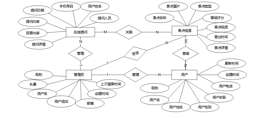 智能旅行助手系统的数据库概念设计通过ER图清晰展示各实体及其关系。核心实体包括用户、景点、评论、评分、提问、回答、公告和论坛帖子。用户与景点间存在预订及评价关系;景点关联评论和评分,反映用户反馈;提问与回答实体形成一对多的关系,支持用户咨询;公告和论坛帖子则分别独立管理平台通知和用户互动内容。各实体间的关系通过外键实现连接,确保数据的一致性和完整性,为系统功能提供可靠的数据支持。E-R实体关系图如下所示。