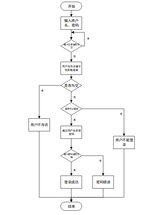 用户输入用户名和密码后,系统先检查输入是否为空,再验证用户名是否存在,若存在则通过用户名获取密码并校验。若密码正确则登录成功,否则提示密码错误。若用户名不存在或无法登录,提示用户操作无效。如图3-2所示。