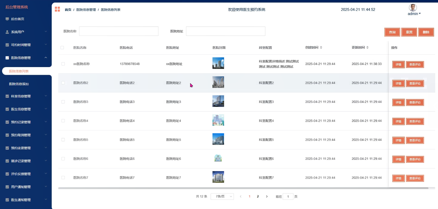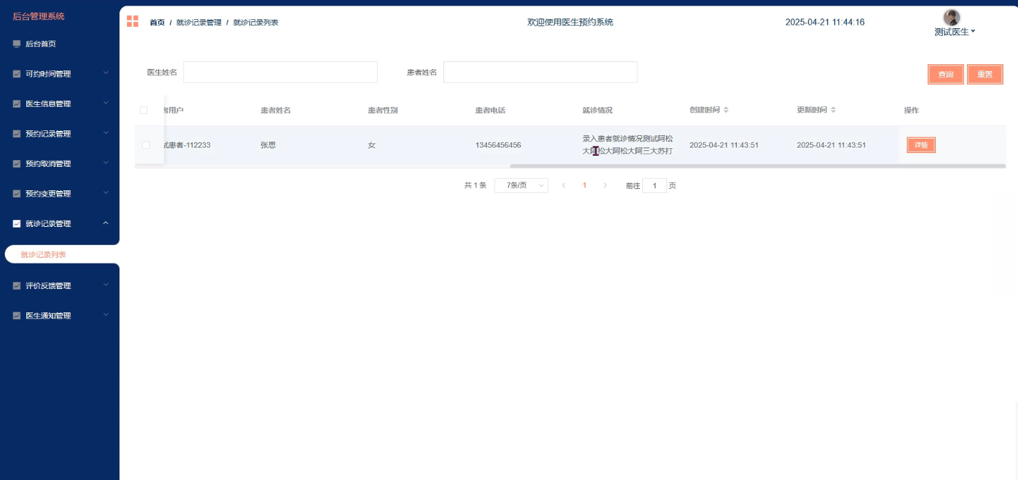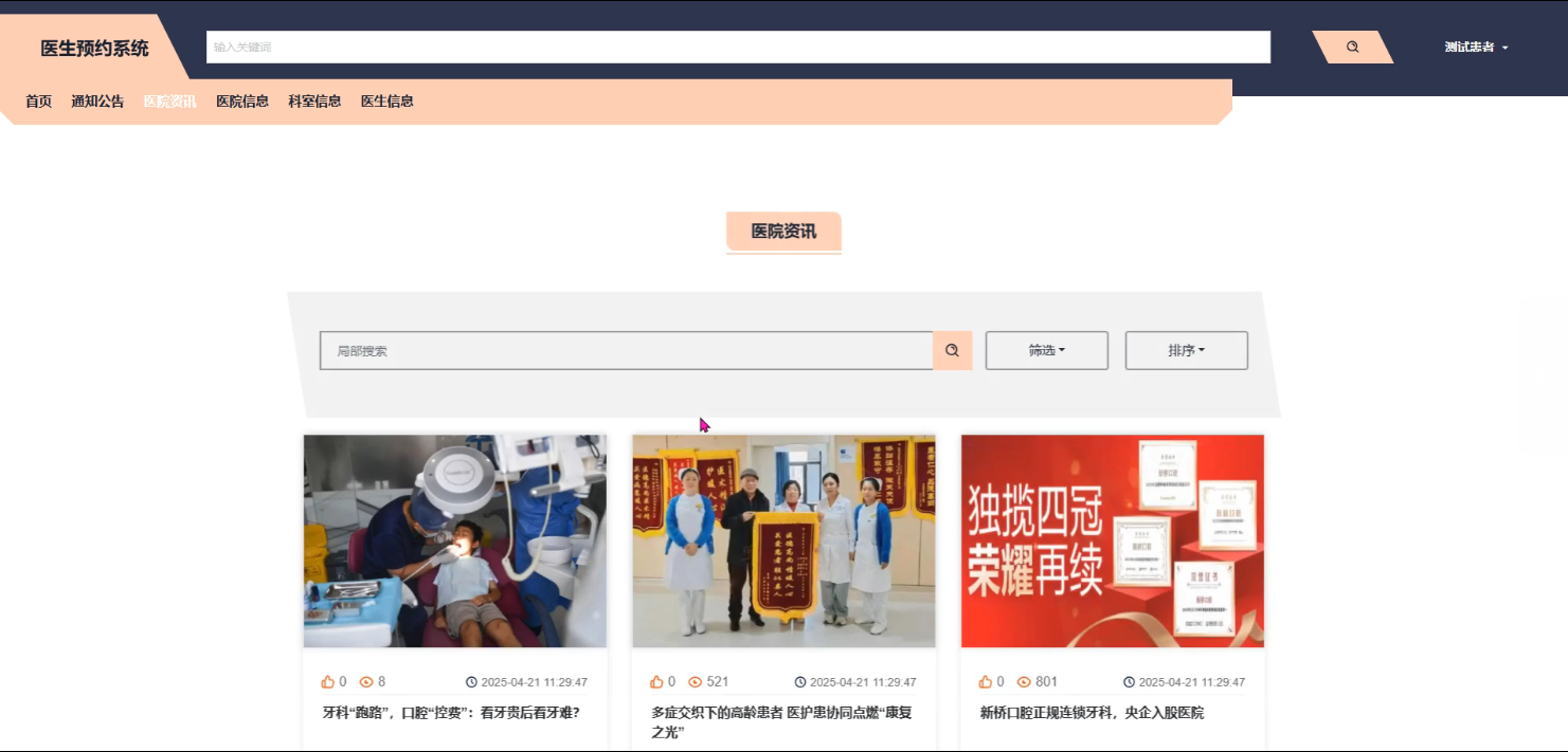The system is mainly divided into three functional modules: patient user, doctor user, and administrator. For patient users, the system provides a one-stop service experience from homepage browsing, hospital information inquiry to appointment registration, personal center management, including appointment records, medical records, evaluation feedback, etc. Doctor users can conveniently manage their available appointment time, view and process appointment records, update personal information, etc. through the system, greatly improving work efficiency. Administrators have the most comprehensive management privileges, including maintaining system user information, hospital department information, appointment records, notifications and announcements, ensuring the normal operation of the system and data security. This system also emphasizes user experience and data security, ensuring the legitimate rights and interests of all types of users through reasonable permission design and strict data protection measures. The implementation of this system not only improves the accessibility and convenience of medical services, but also provides a feasible solution for the digital transformation of medical institutions.