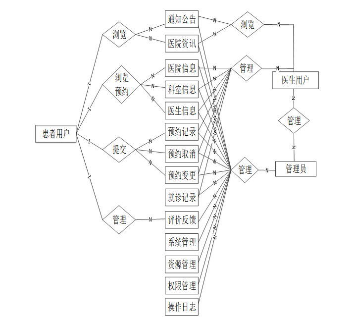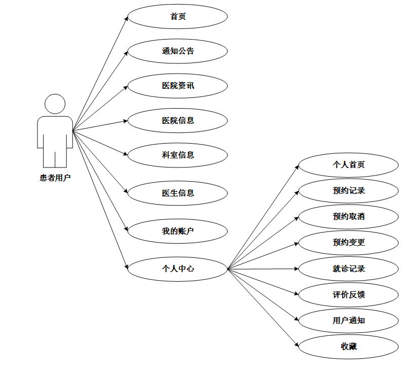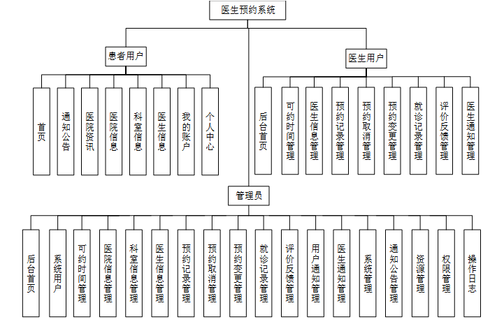 系统主要分为三个角色的功能模块:患者用户、医生用户以及管理员。对于患者用户而言,系统提供了从首页浏览、医院资讯查询到预约挂号、个人中心管理,包括预约记录、就诊记录、评价反馈等的一站式服务体验。医生用户能够通过系统便捷地管理自己的可约时间、查看及处理预约记录、更新个人信息等,极大提升了工作效率。而管理员则拥有最全面的管理权限,包括对系统用户信息、医院科室信息、预约记录、通知公告等进行维护,确保系统的正常运行和数据的安全性。本系统还特别强调了用户体验和数据安全,通过合理的权限设计和严格的数据保护措施,保障了各类型用户的合法权益。通过这一系统的实施,不仅提高了医疗服务的可达性和便利性,同时也为医疗机构的数字化转型提供了一个可行的解决方案。