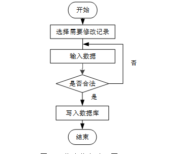 用户首先选择需要修改的记录,输入修改后的数据,系统判断输入数据是否合法。若数据不合法,提示重新输入;若数据合法,则将修改后的数据写入数据库,完成操作后流程结束。修改信息流程图如图3-5所示。