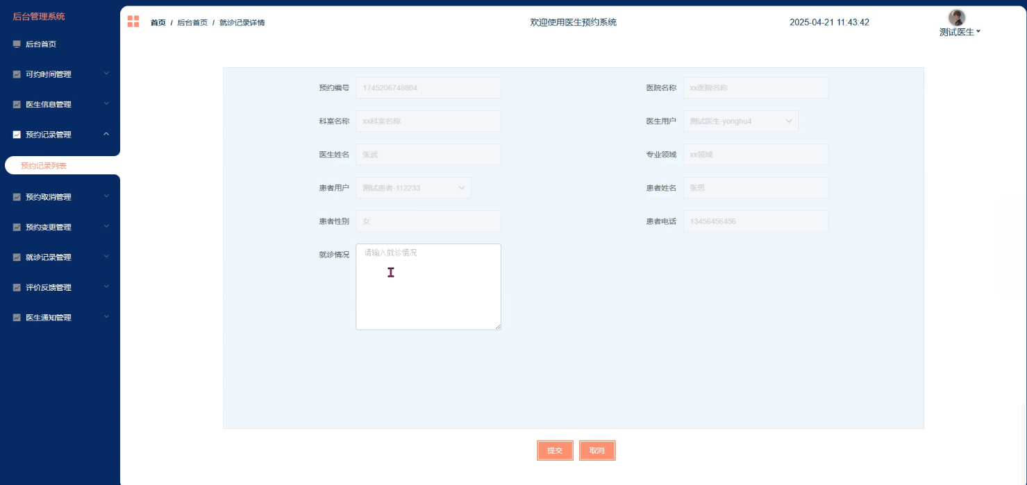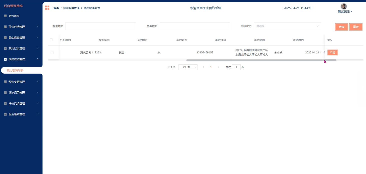 (5)预约取消管理:提供处理患者预约取消请求的功能,使医生能够及时调整工作安排。
