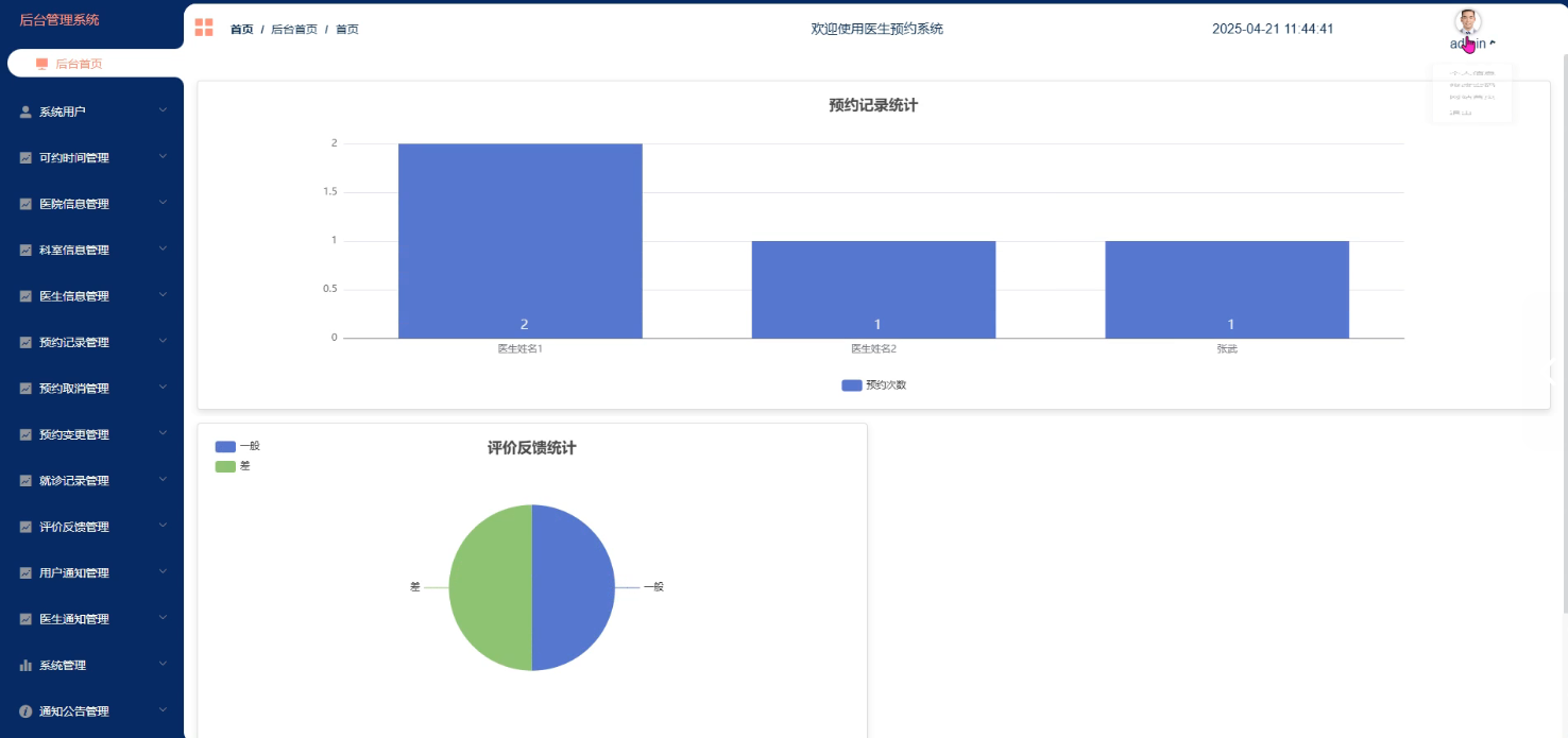 (1)后台首页:提供医院运营数据的统计与分析,帮助管理员全面了解医院的工作状态。