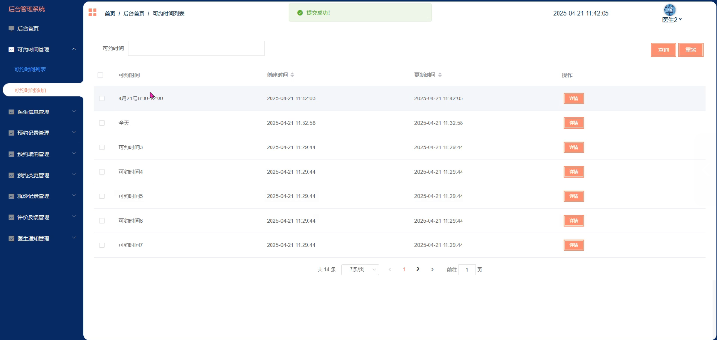 (3)可约时间管理:统一管理和调整医生的可预约时间段,确保医疗服务资源的合理分配。