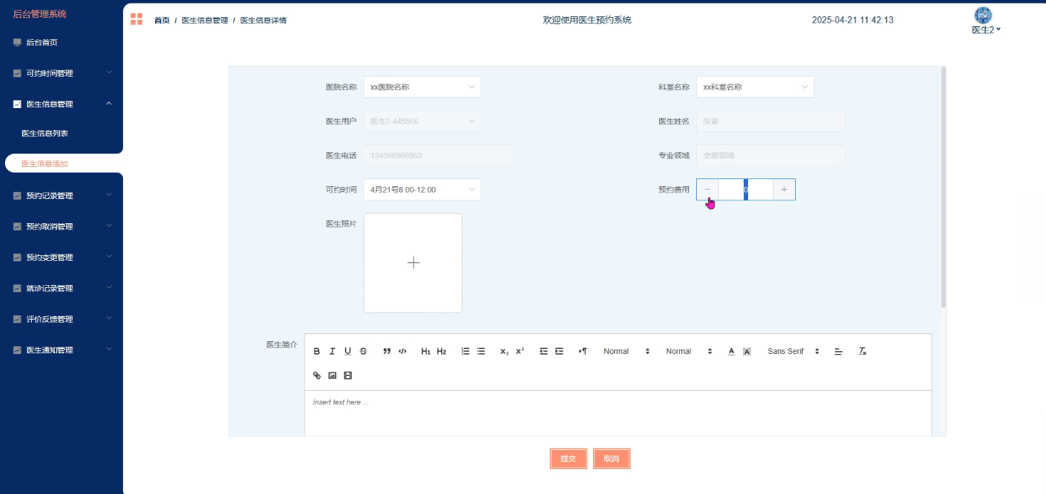 | 测试流程 | 1)医生信息管理页面,点击医生信息添加,点击按钮,输入相关信息,包括电话、专业领域、可约时间、预约费用等。 2)点击进行提交。 |