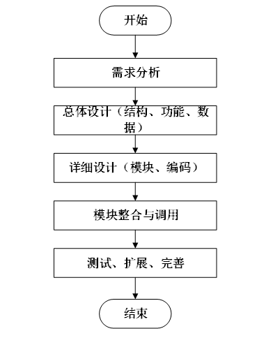 系统开发流程的主要步骤,从需求分析到系统完成的全过程。流程包括需求分析、总体设计(结构、功能、数据)、详细设计(模块、编码)、模块整合与调用,以及测试、扩展和完善,最终完成系统的开发。本系统的开发流程如图3-1所示