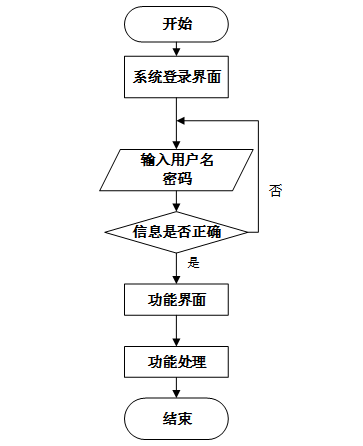 用户首先进入系统登录界面,输入用户名和密码后,系统验证信息是否正确。若验证失败,返回登录界面重新输入;若验证成功,则进入功能界面,执行相应功能处理后结束操作流程。操作流程如图3-3所示。