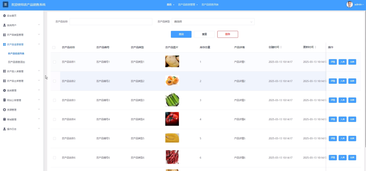 农产品入库管理:农产品入库列表,管理员可以通过此功能查看所有入库记录,支持对入库记录进行查询、重置或删除等操作,确保库存数据的准确性。