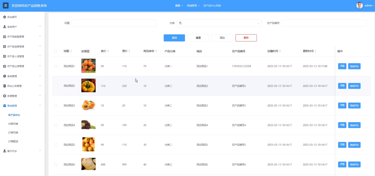 在农产品中心,管理员可以查询现有商品,执行新增商品操作,填写标题、描述、价格、库存、分类等必要信息,并能查看评论以获取用户反馈。分类列表,显示所有商品分类及其包含的商品数,管理员可以据此优化商品布局和分类策略。订单列表功能使管理员能够查看每个订单的详细信息、当前状态及配送情况,有助于监控交易流程。订单配送,提供订单配送相关的管理功能,包括查询特定订单、重置搜索条件、删除无效记录、查看详情以及确认签收等操作,保障物流环节的透明度和效率。商城管理界面如图所示。