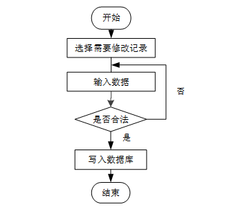 用户首先选择需要修改的记录,输入修改后的数据,系统判断输入数据是否合法。若数据不合法,提示重新输入;若数据合法,则将修改后的数据写入数据库,完成操作后流程结束。修改信息流程图如图3-7所示。