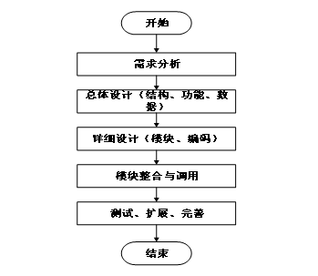 系统开发流程的主要步骤,从需求分析到系统完成的全过程。流程包括需求分析、总体设计(结构、功能、数据)、详细设计(模块、编码)、模块整合与调用,以及测试、扩展和完善,最终完成系统的开发。本系统的开发流程如图3-3所示