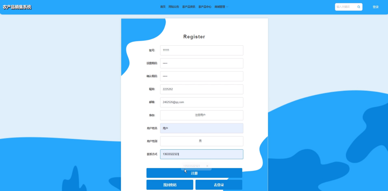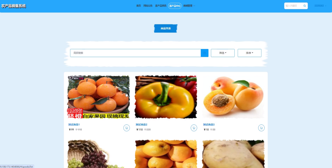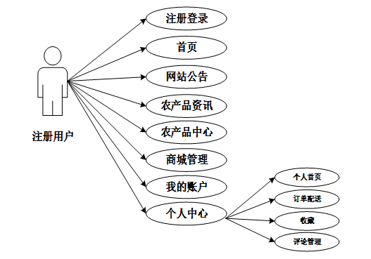 注册用户可注册登录进前台系统界面,系统界面由注册登录、首页、网站公告、农产品资讯、农产品中心,商城管理、我的账户和个人中心(个人首页、订单配送、收藏、评论管理)等功能组成,每一项设计都是为了提升用户体验和满足其多样化的购物需求。具体的功能如下: