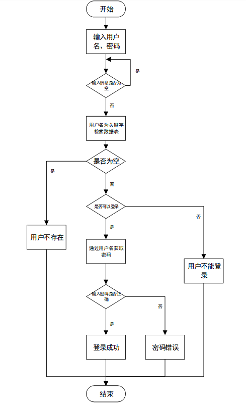 用户输入用户名和密码后,系统先检查输入是否为空,再验证用户名是否存在,若存在则通过用户名获取密码并校验。若密码正确则登录成功,否则提示密码错误。若用户名不存在或无法登录,提示用户操作无效。如图3-4所示。