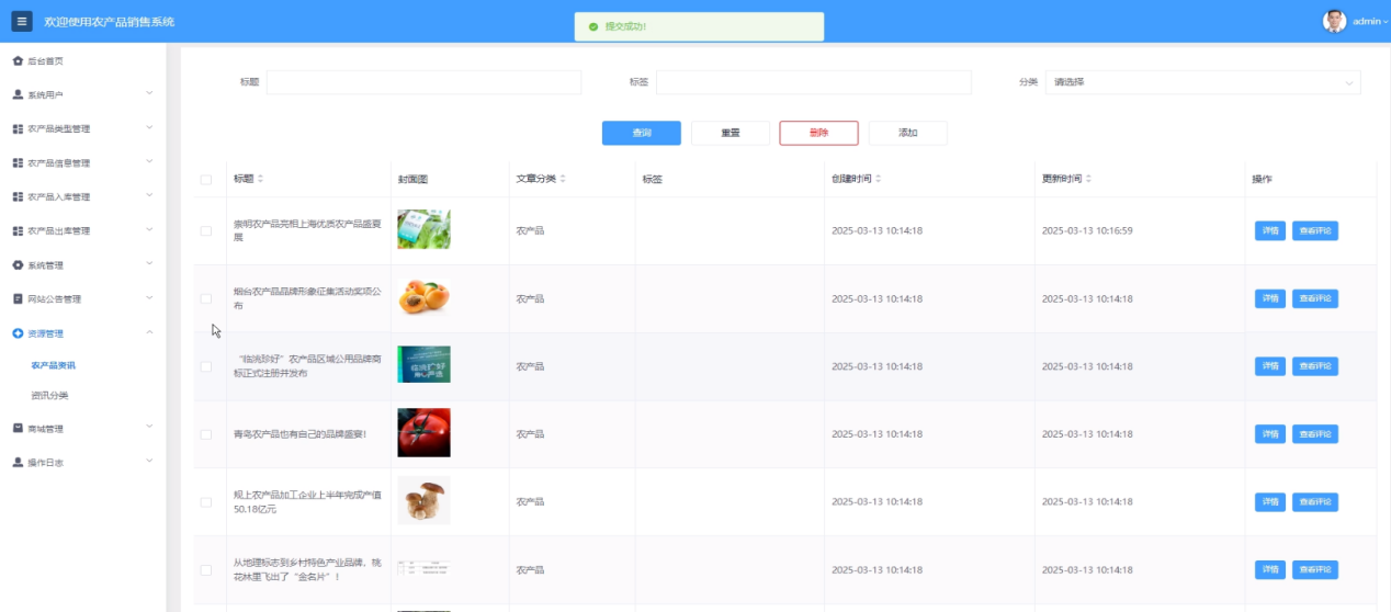 资源管理(农产品资讯、资讯分类):提供对农产品相关资讯的管理和分类功能,管理员可以添加、编辑或删除资讯内容,同时管理资讯分类以便于用户浏览。