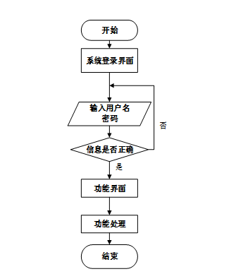 用户首先进入系统登录界面,输入用户名和密码后,系统验证信息是否正确。若验证失败,返回登录界面重新输入;若验证成功,则进入功能界面,执行相应功能处理后结束操作流程。操作流程如图3-5所示。