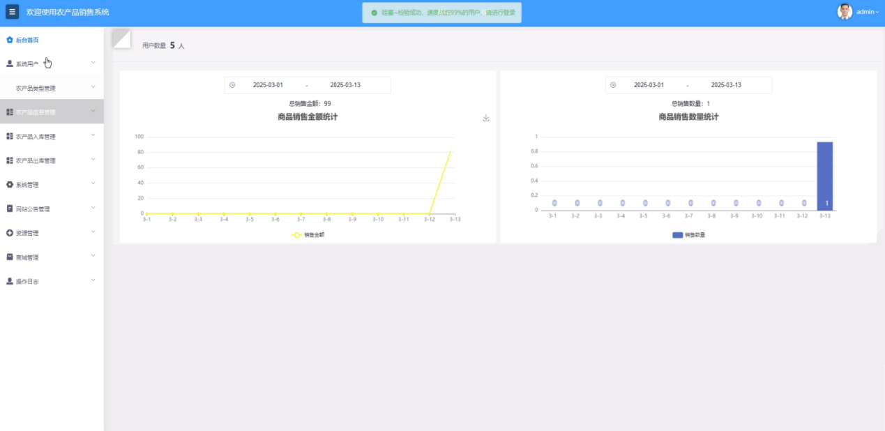 后台首页:提供了直观的商品销售数据统计,包括销售额和销售量,帮助管理员快速了解业务概况并作出相应决策。