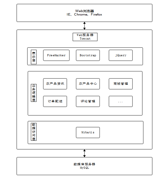 系统由表现层、业务逻辑层、数据访问层和数据库服务器组成。表现层通过浏览器(如IE、Chrome、Firefox)与用户交互,采用FreeMarker、Bootstrap、jQuery等技术实现界面呈现。业务逻辑层负责处理系统的核心业务逻辑,通过分模块设计实现功能分离。数据访问层使用MyBatis框架连接数据库,执行数据的增删改查操作。数据库服务器采用MySQL进行数据存储和管理,为系统提供稳定的数据库支持。整个架构通过Tomcat服务器完成用户请求的接收和处理,确保系统的高效运行[8]。整个系统架构如图4-1所示。