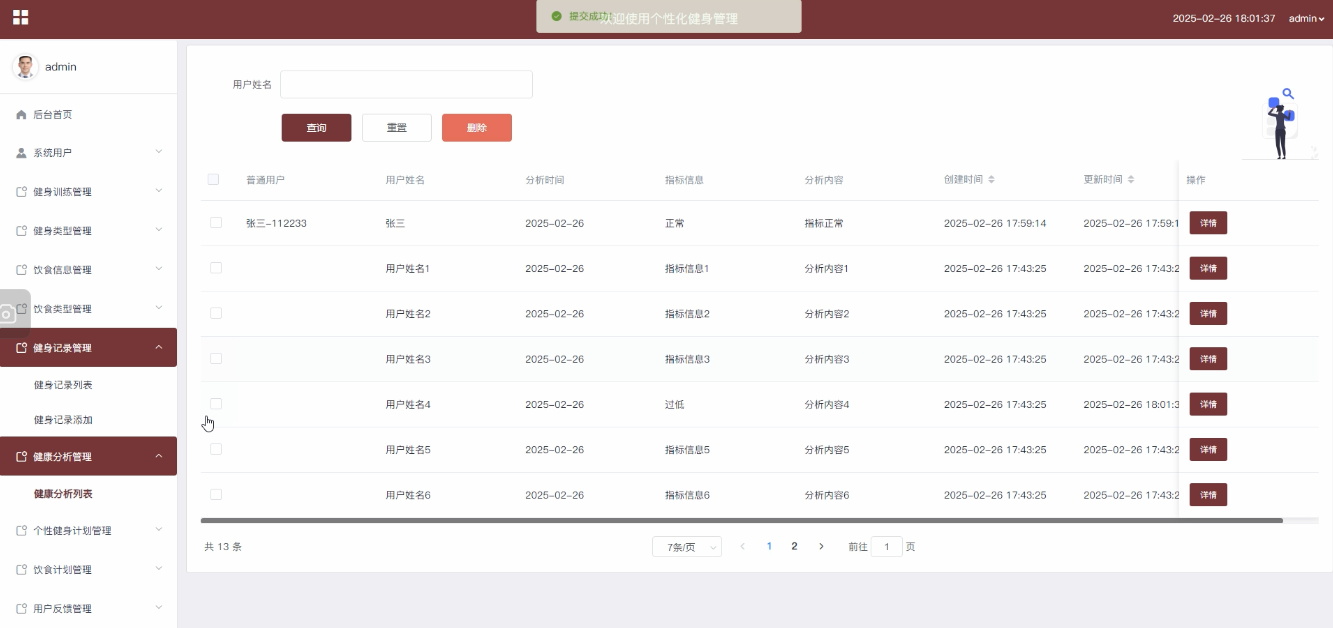 管理员拥有查看和删除健康分析列表的权限,对用户的健康情况进行分析,并提交分析建议,使用机器学习算法分析用户健康状况,并根据分析结果调整健身方案。界面如图5-14所示。