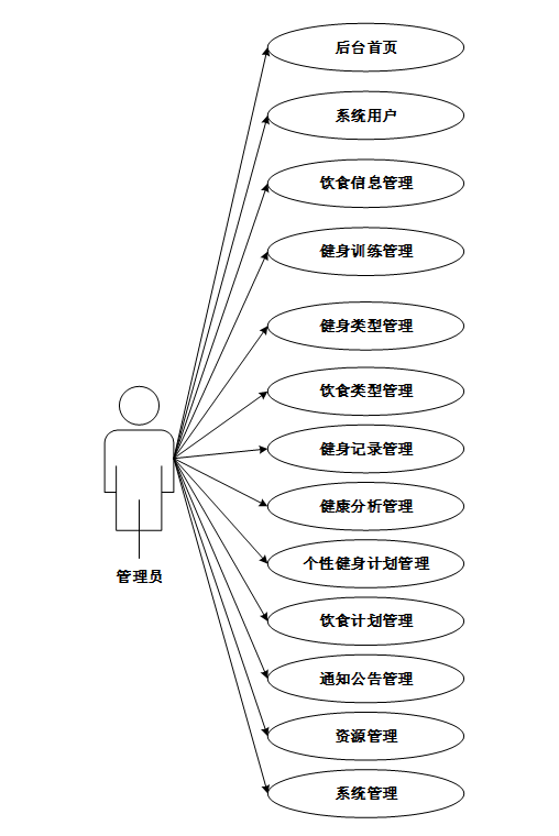个性化健身管理功能方面,普通用户模块功能包括注册登录、首页、健身资讯、公告通知、饮食信息、个人中心、我的账户;管理员模块功能包括后台首页、系统用户、饮食信息管理、饮食类型管理、健身训练管理、系统管理、公告通知管理、资源管理。具体如下: